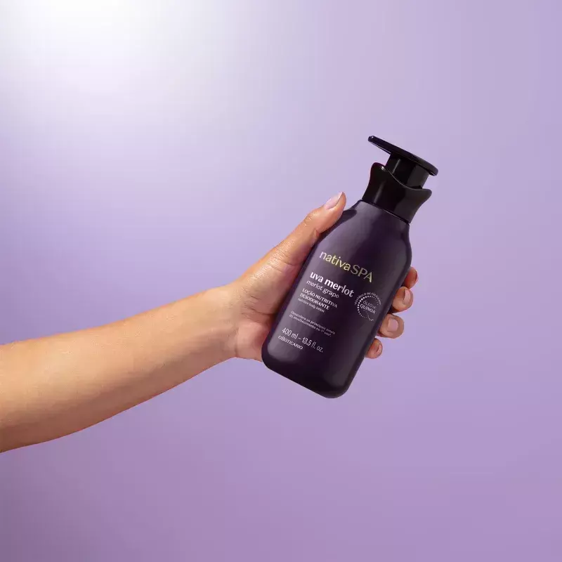 Com Óleo de Quinoa² e Óleo de semente de uva, a Loção Hidratante Desodorante Corporal Nativa SPA Uva Merlot hidrata intensamente por até 48h, aumenta a produção de colágeno³ e previne o ressecamento, para uma pele mais firme e macia. Este hidratante de uva vem com embalagem refilável para repor com praticidade.