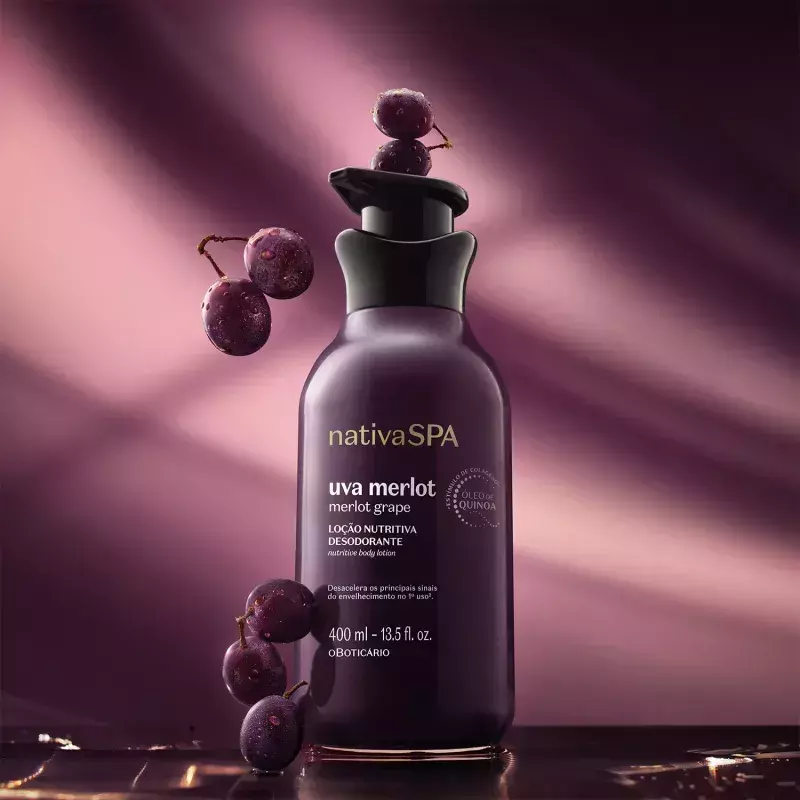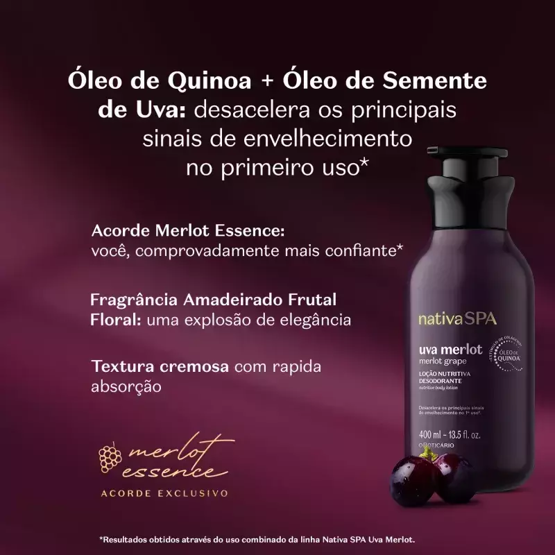 O Combo Completo Nativa Spa Uva Merlot te convida a degustar o prazer da sua própria companhia com a potência da loção corporal, que desacelera os principais sinais do tempo desde o primeiro uso¹, recuperando o tempo que sempre foi seu. Combo com refil, a fragrância traz o acorde Merlot Essence, que promove sensação de confiança e bem-estar4: