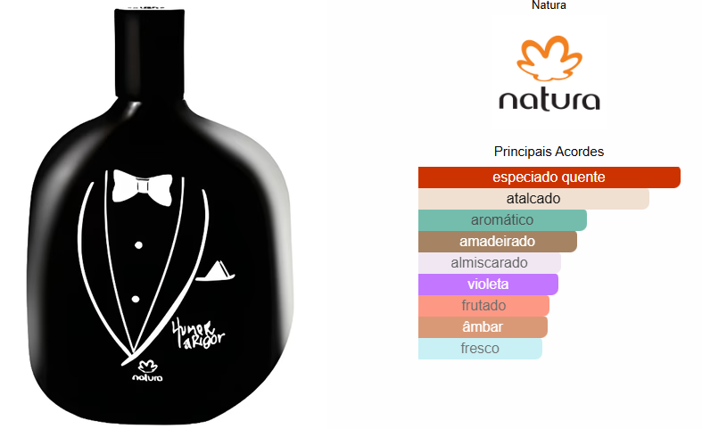 Humor a Rigor de Natura é um perfume Amadeirado Aromático Masculino. Humor a Rigor foi lançada em 2014. O perfumista que assina esta fragrância é Verônica Kato. As notas de topo são: Cardamomo, Maçã e Toranja. As notas de coração são: Violeta e Heliotrópio. As notas de fundo são: Sândalo, Almíscar e Âmbar.