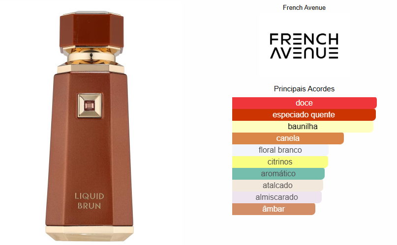 Liquid Brun de French Avenue é um perfume Amadeirado Masculino. Liquid Brun foi lançada em 2024. As notas de topo são: Canela, Flor de Laranjeira, Cardamomo e Bergamota. As notas de coração são: Baunilha de Bourbon e Elemi. As notas de fundo são: Pralinê, Ambroxan, Madeira Guaiac e Almíscar.