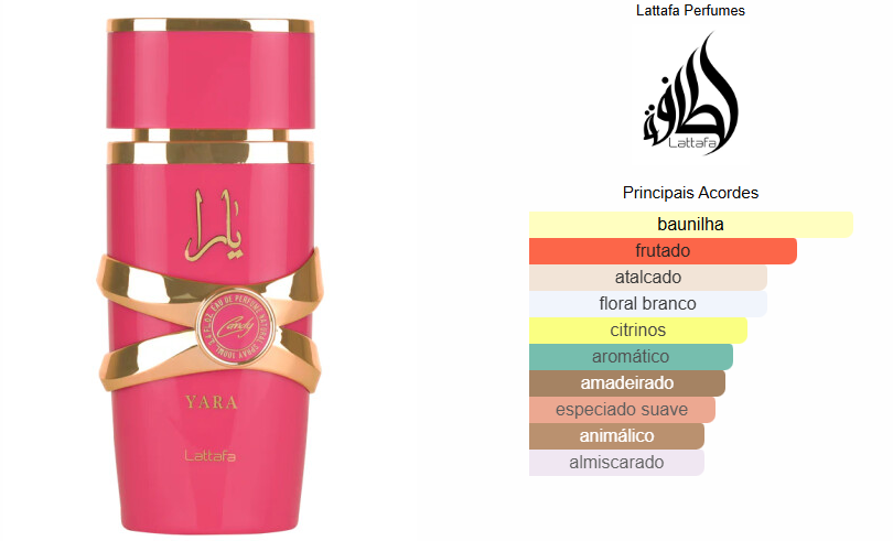 Yara Candy de Lattafa Perfumes é um perfume Floral Frutado Gourmet Feminino. Esta é uma nova fragrância. Yara Candy foi lançada em 2024. As notas de topo são: Groselha Preta e Tangerina Verde. As notas de coração são: Strawberry Fizz Candy e Gardênia. As notas de fundo são: Baunilha, Âmbar, Sândalo e Almíscar.
